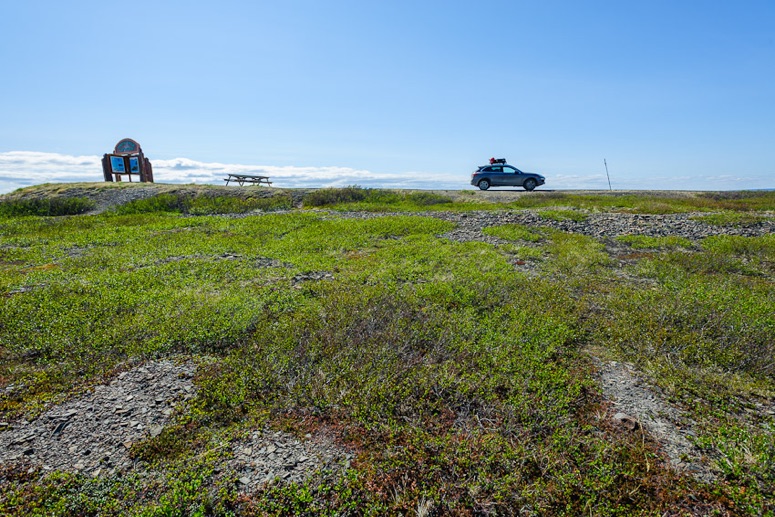 At the Arctic Circle monument. The Dempster Highway runs nearly 500 unpaved miles (800 km) from the Klondike Highway near Dawson to Inuvik.