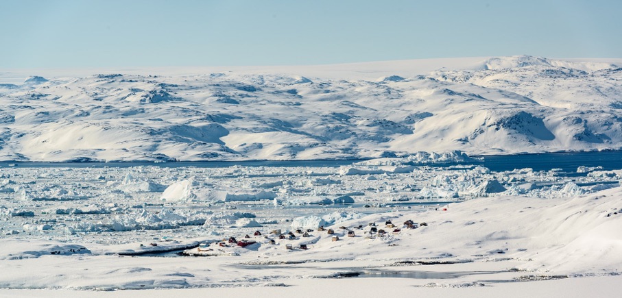 Tiniteqilaaq VIllage, pop. 134, dwarfed by the massive icebergs of the Sermilik ice fiord descending from the Helheim Glacier, East Greenland. 65°52'4" N 37°43'5" W