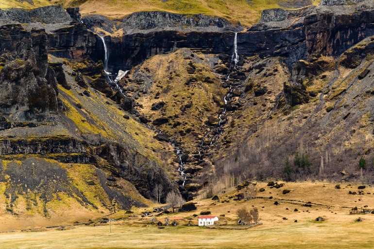 Water falls descend from Lómagnúpur highlands above a ranch east of Kálfafell. South coast. 63°57'26" N 17°33'41" W