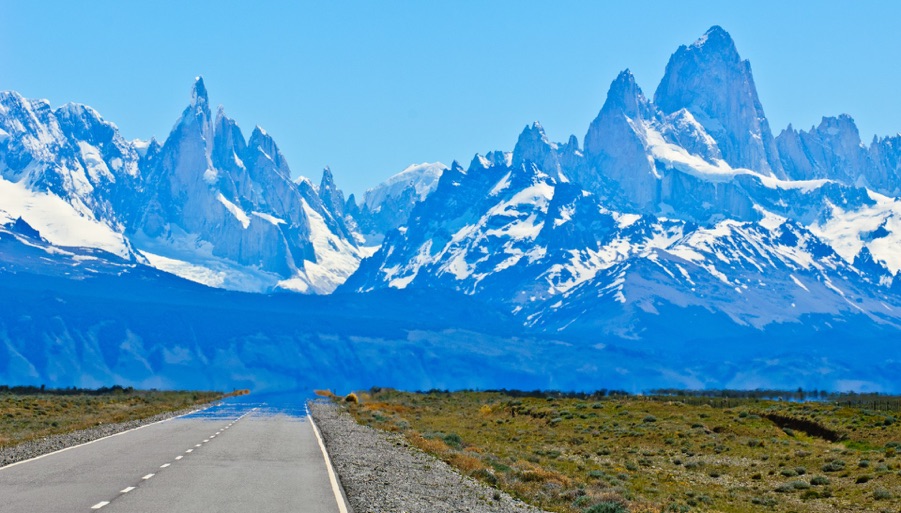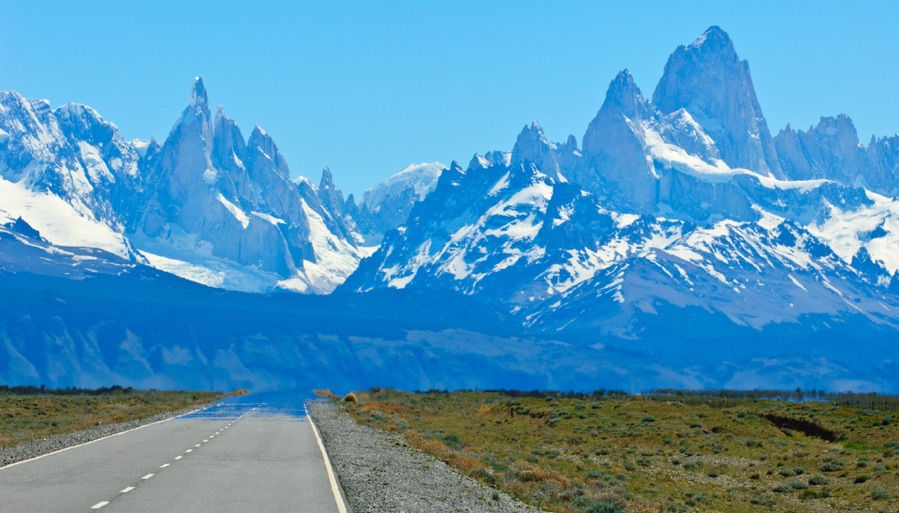 The road to El Chalten, Argentina. The peaks of Fitzroy and Cerro Torre, tower ahead on a rare and perfect cloudless day.