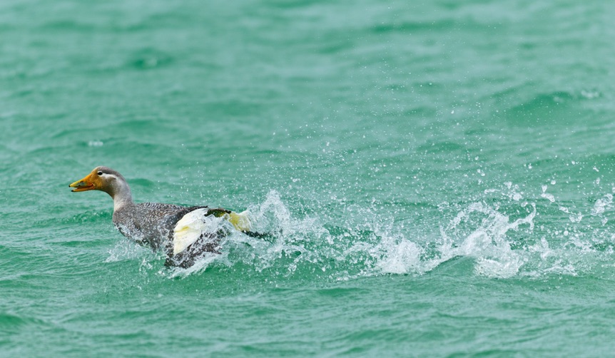 Flying steamer duck (Tachyeres patachonicus). The green on the bill would seem to identify this is as the flying rather than the flightless version, though this one did no flying. Just "steamed" in panic across the water. From boat on Rio Deseado estuary. Atlantic coast, Argentina.