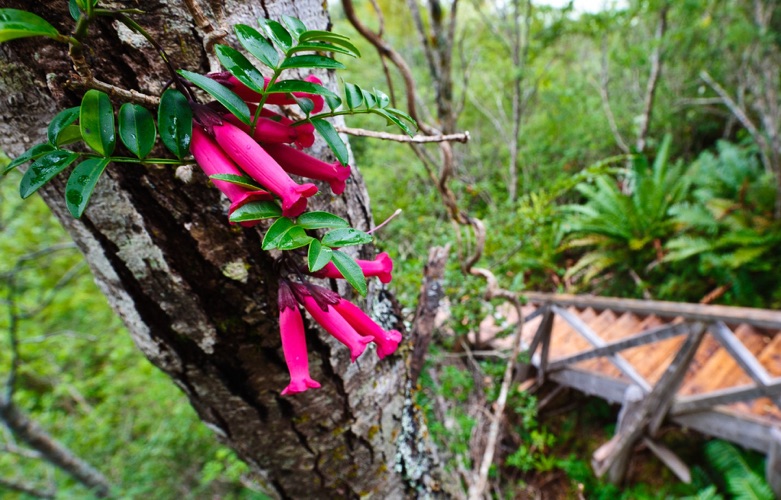 Far south in Chile, off the Careterra Austral on a new spur road, Caleta Tortel hangs on the side of a fiord with no cars or roadways. Many kilometers of "pasarelas", boardwalks and staircases, connect the houses of this special place.