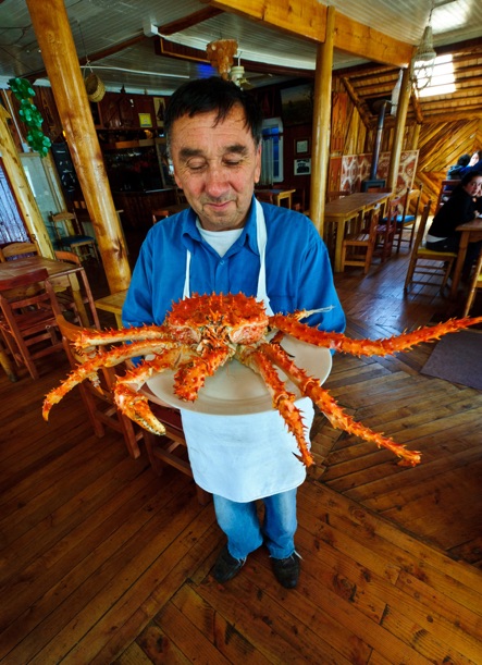 El Chejo Restaurant. Quemchi, Chiloé, Chile. Perhaps the best restaurant in southern Chile, on a coastal gravel road. Wonderful king crab empanadas. The owner with the day's crab.
