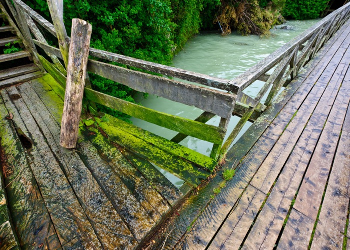 Far south in Chile, off the Careterra Austral on a new spur road, Caleta Tortel hangs on the side of a fiord with no cars or roadways. Many kilometers of "pasarelas", boardwalks and staircases, connect the houses of this special place.