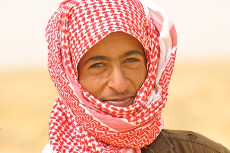 Bedouin camel herder in desert sand storm near Qasr al hir ash Sharqi.
